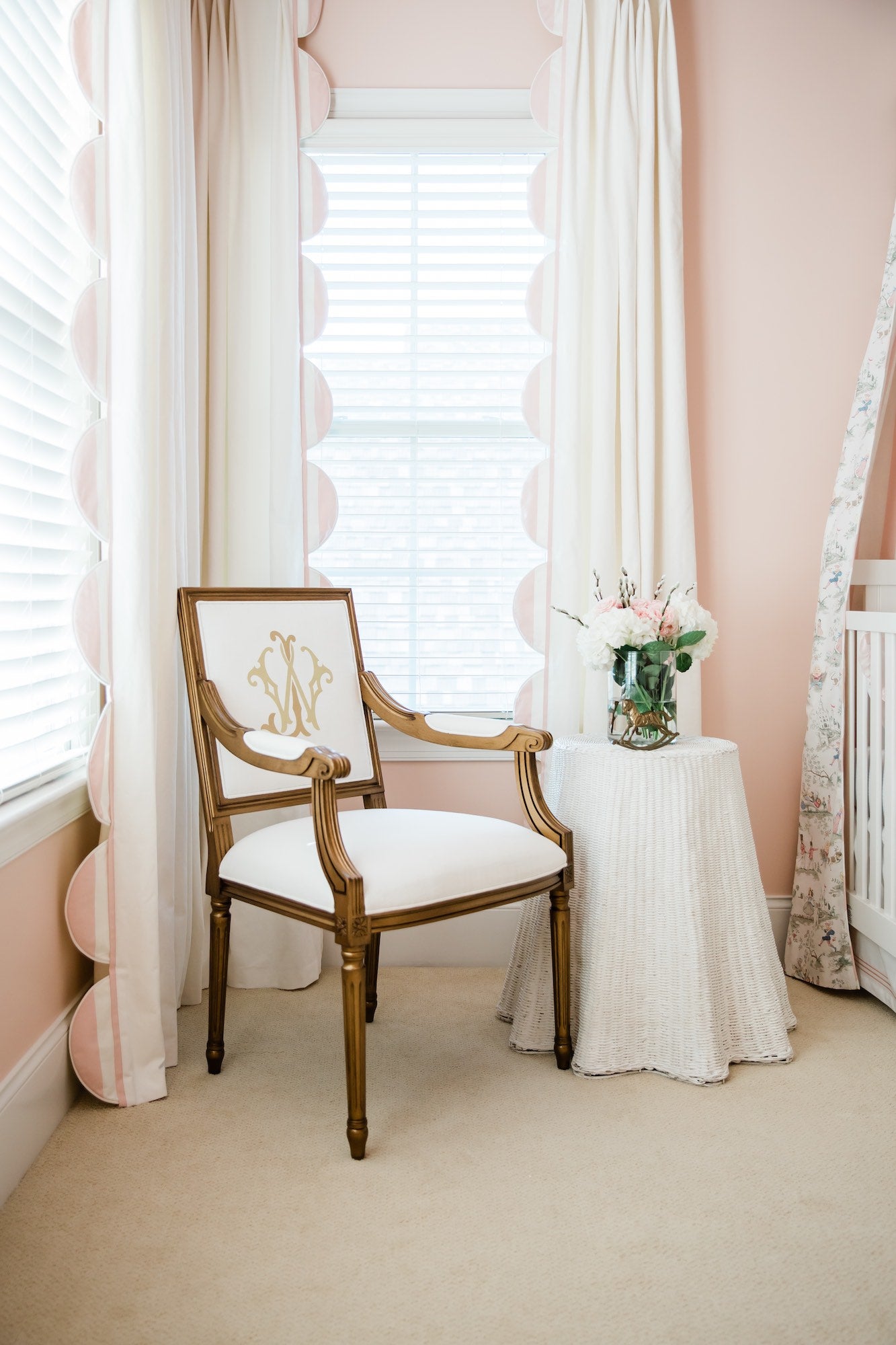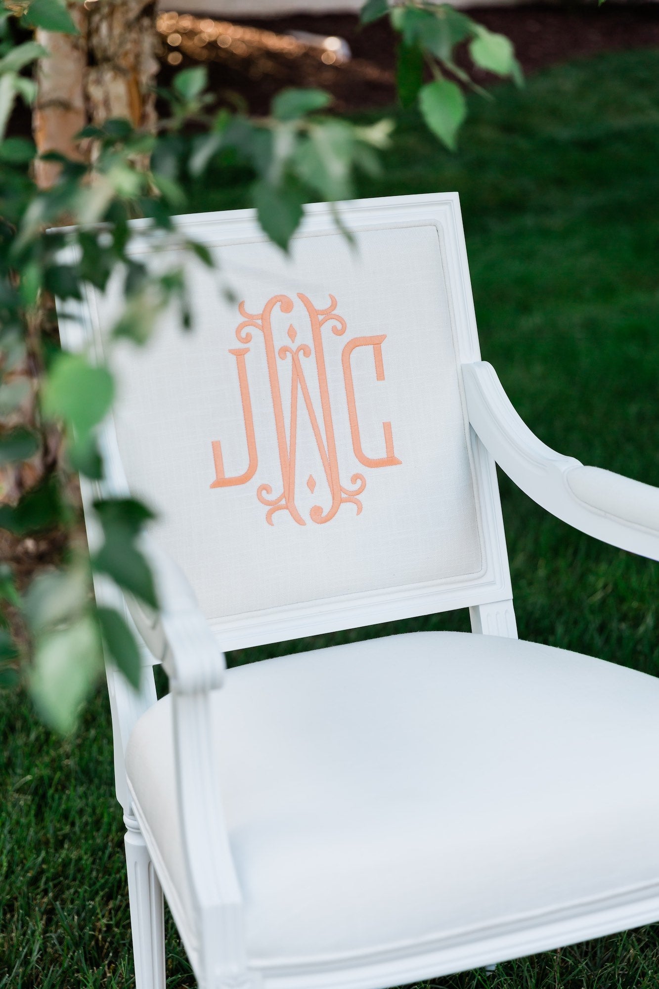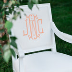 The design feature utilized above is a tool that approximates finish, fabric, monogram style, size, placement, interlocking letters, and thread color. The image created is a composite of the options selected and best used for proofing purposes. The Lifestyle pictures featured throughout the website are much truer representations of the quality, craftsmanship, and overall beauty of the chair(s) you will receive.