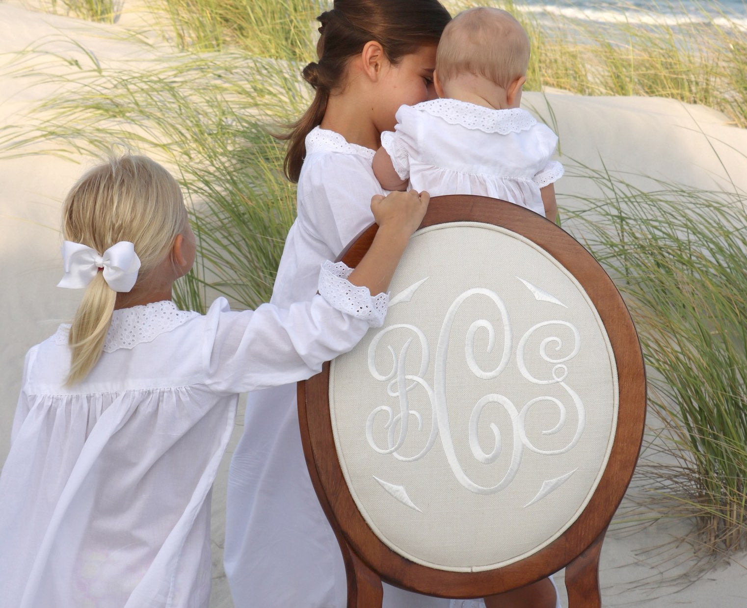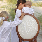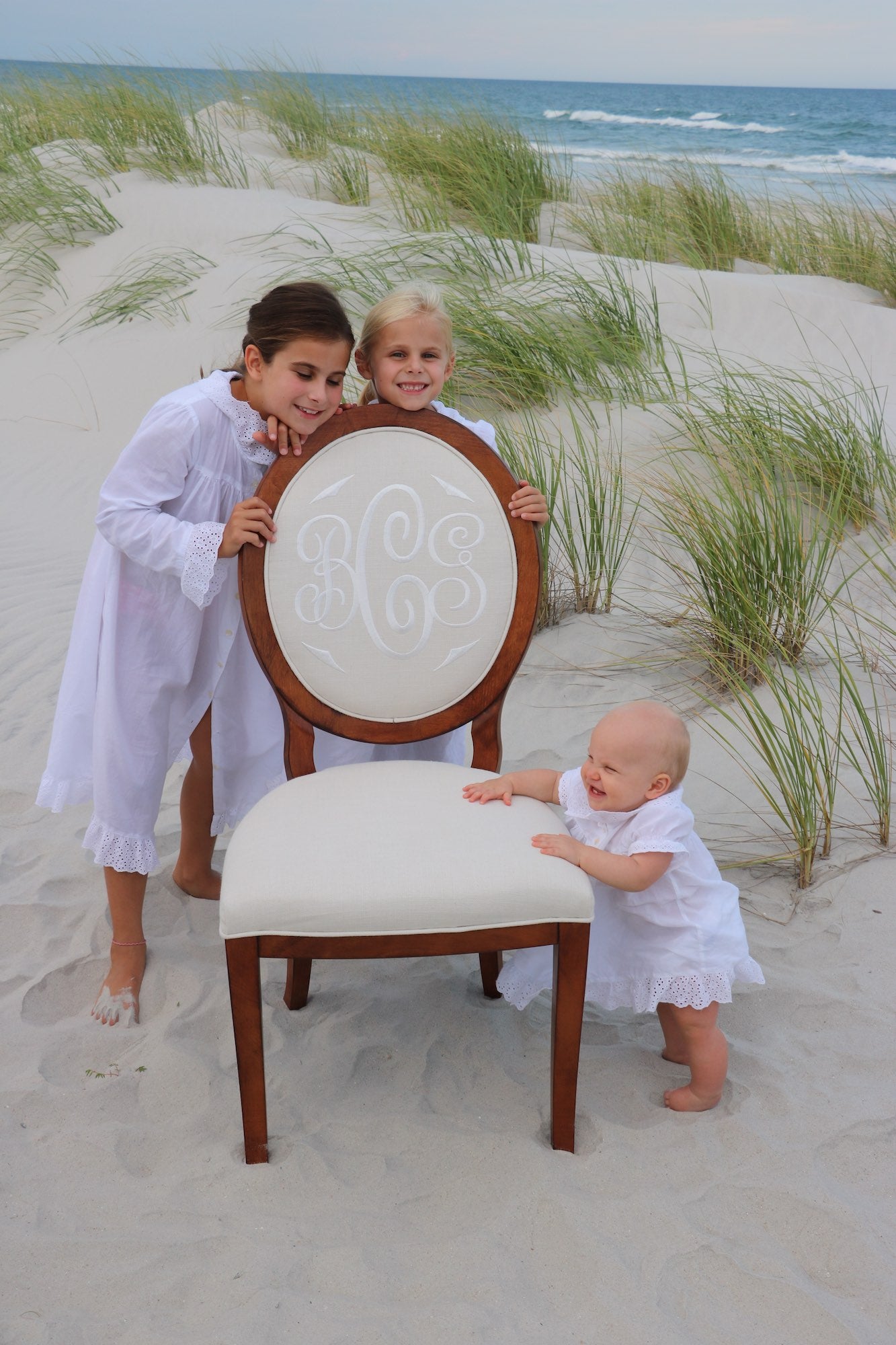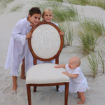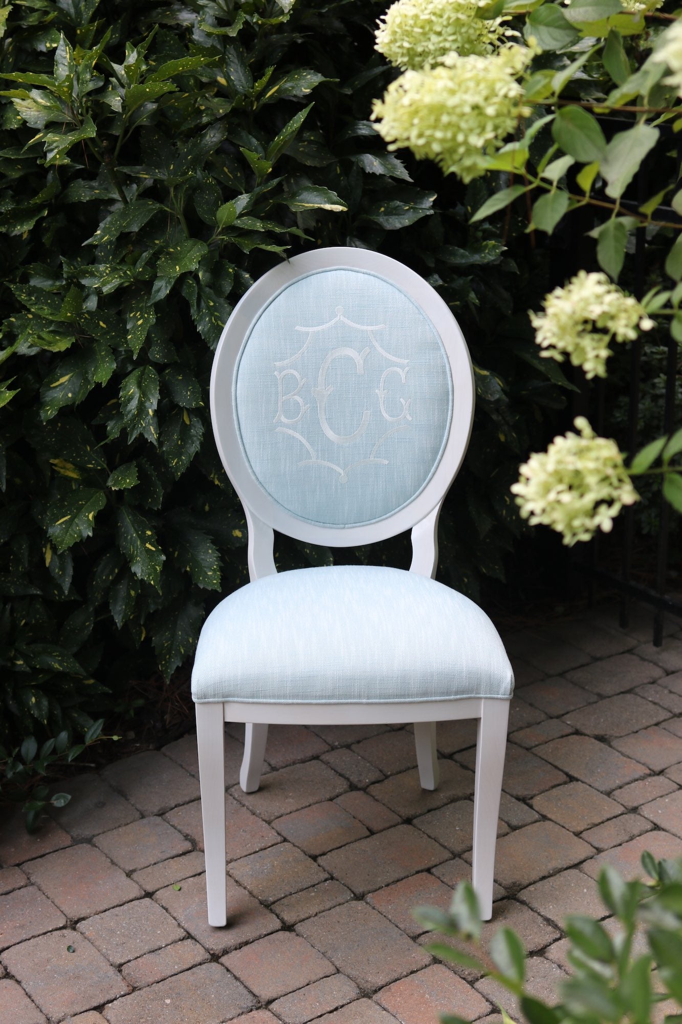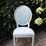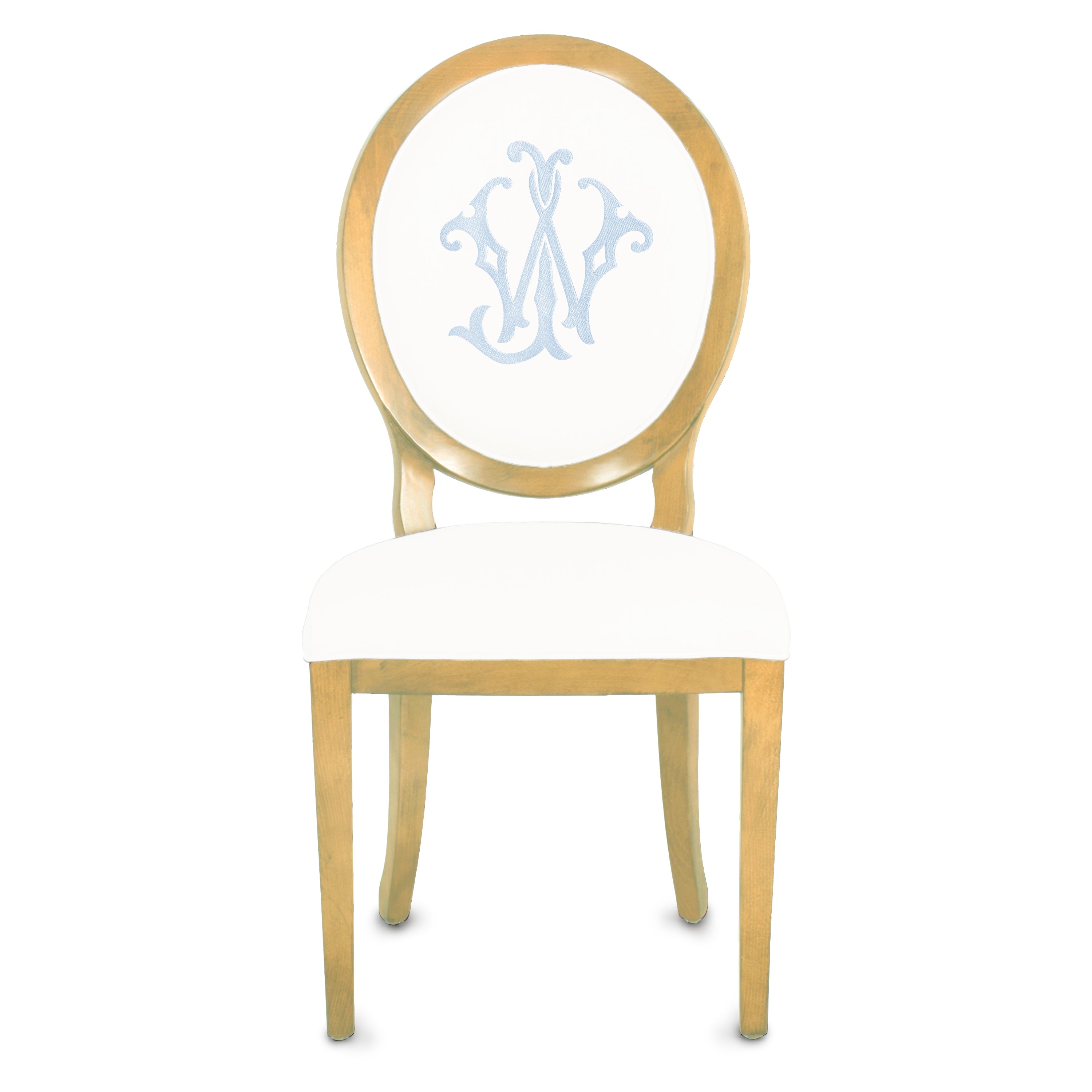 The design feature utilized above is a tool that approximates finish, fabric, monogram style, size, placement, interlocking letters, and thread color. The image created is a composite of the options selected and best used for proofing purposes. The Lifestyle pictures featured throughout the website are much truer representations of the quality, craftsmanship, and overall beauty of the chair(s) you will receive.